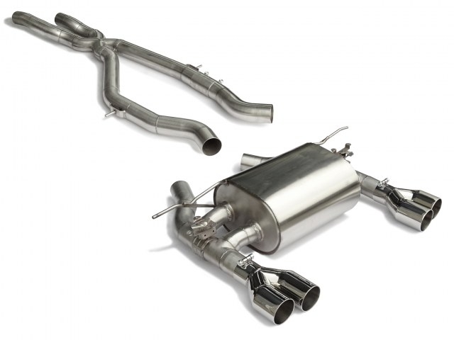 Mittelrohr in Edelstahl + Endschalldämpfer in Edelstahl rechts/links mit je ER 2x80 mm rund Race Line versetzt  mit integrierten Klappen.Die Steuerung der Klappen erfolgt durch die Serienelektronik der Klappe. Vergrößerter Rohrdurchmesser 70 mm